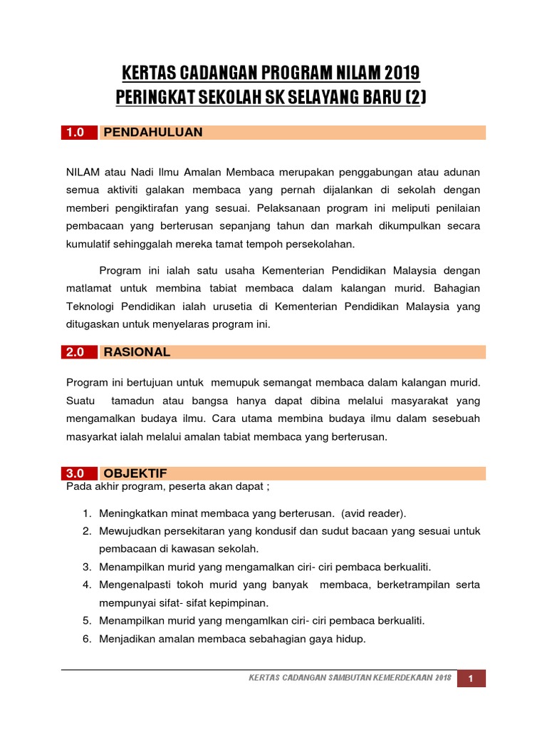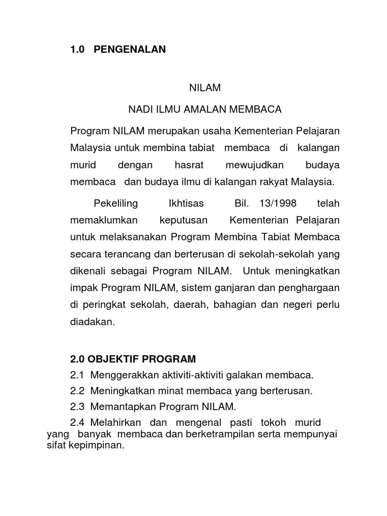 10 PENDAHULUAN NILAM atau Nadi Ilmu Amalan Membaca merupakan penggabungan atau adunan semua aktiviti galakan membaca yang pernah dijalankan di sekolah dengan memberi pengiktirafan yang sesuai. Program ini adalah sebagai pengganti kepada. Contoh Kertas Kerja Program Nilam.
